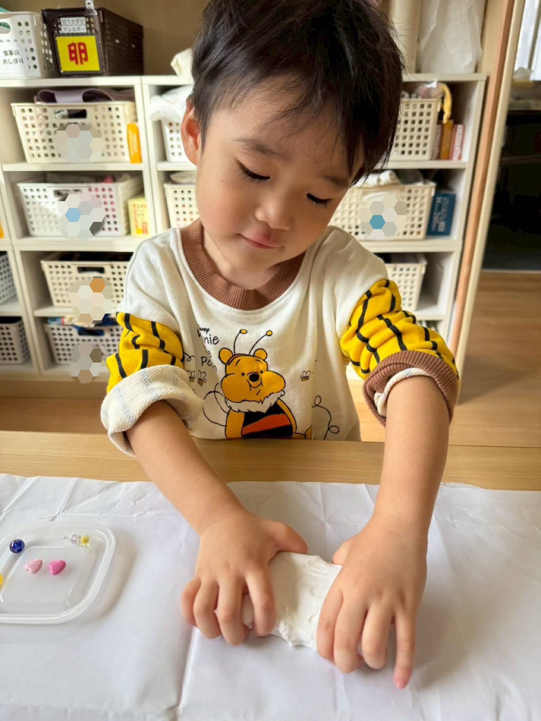 ぱんだ組さんは紙粘土を丸めて可愛いビーズを飾って、素敵な写真立てを