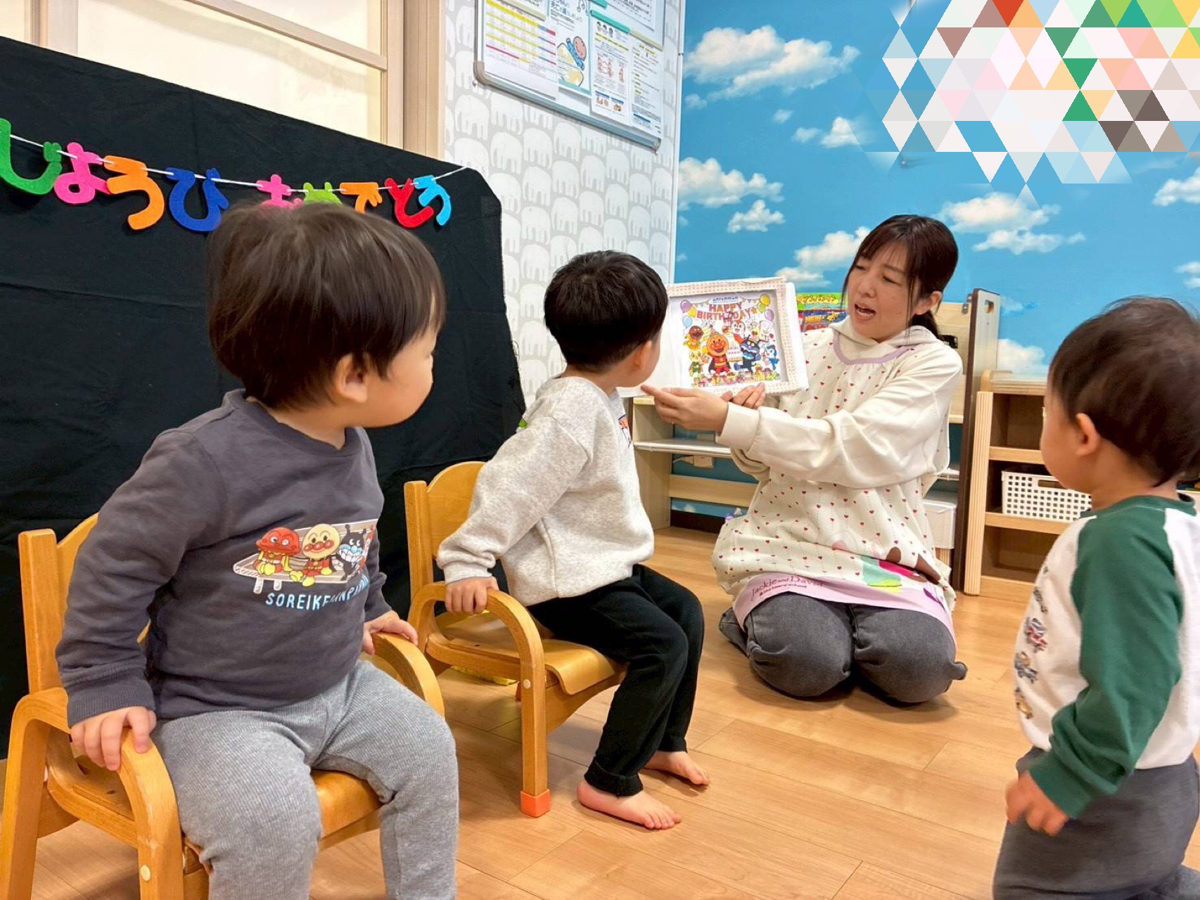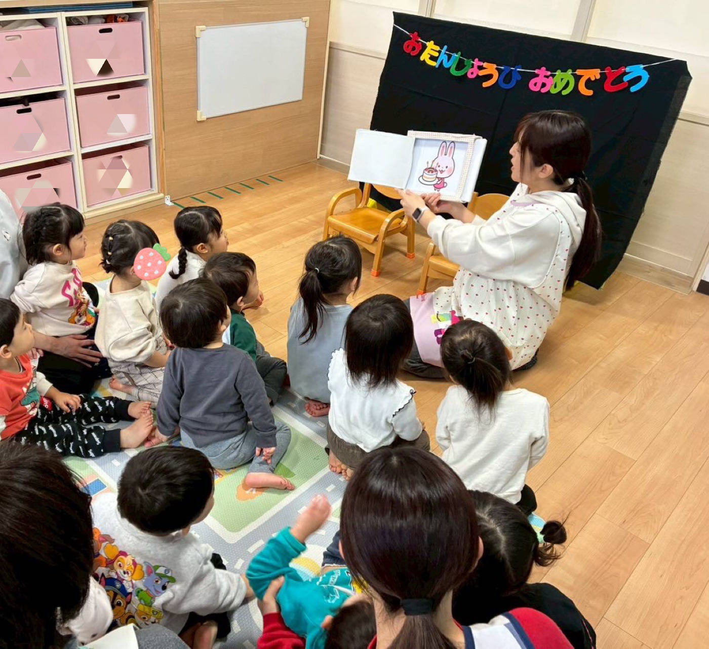 担当保育士による、「トントントン、どなたです~♪」の歌にみんな興味津々👀✨